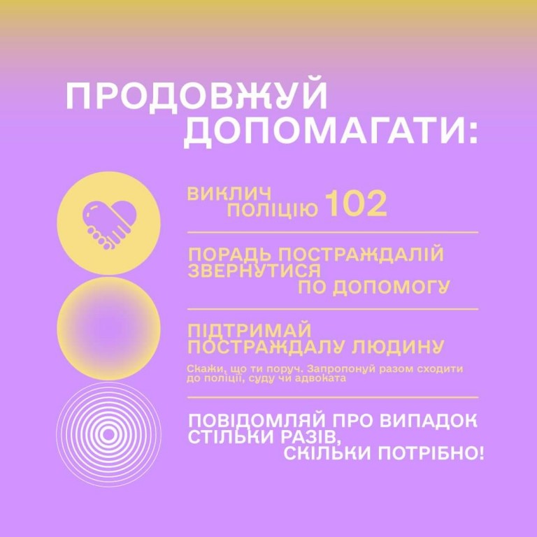 Іноді ситуації домашнього насильства повторюються. Будь ласка, не розчаровуйся, продовжуй допомагати!Людина може не усвідомлювати, що зіштовхується з насильством. Бути неготовою розірвати коло насильства чи боятися докорінно змінити своє життя. Постраждалі можуть багато разів йти і багато разів повертатися.Щоби знайти сили вийти з-під контролю кривдника – потрібен час. Але твоя підтримка…