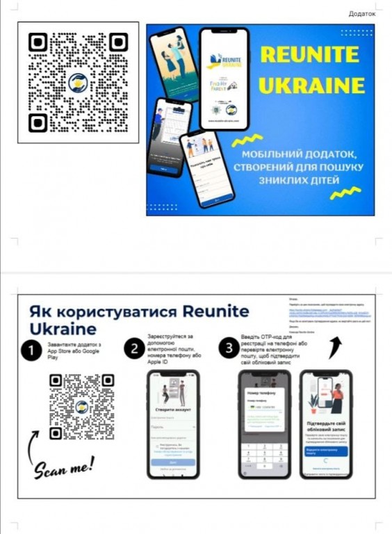 Електронний QR-код з посиланням на мобільний додаток “Reunit Ukraine”, орієнтований на пошук зниклих безвісті дітей. КЗ "Кам'янсько-Дніпровська загальноосвітня школа І-ІІІ ступенів…