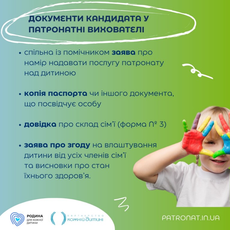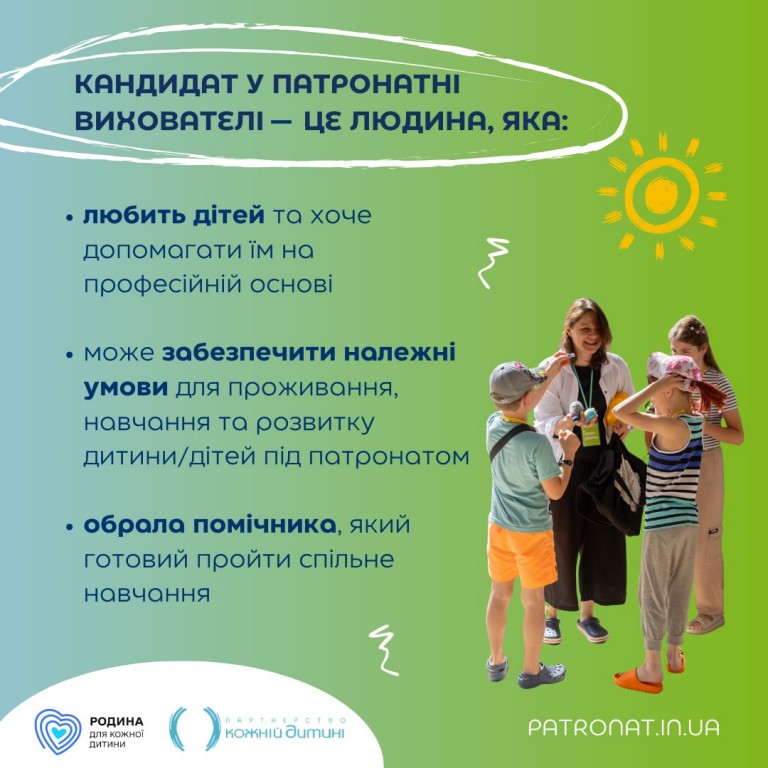 🙌 Послугу патронату над дитиною патронатний вихователь надає разом із помічником. Допомагати може повнолітній член сім’ї чи інша людина, яку обрав патронатний вихователь.