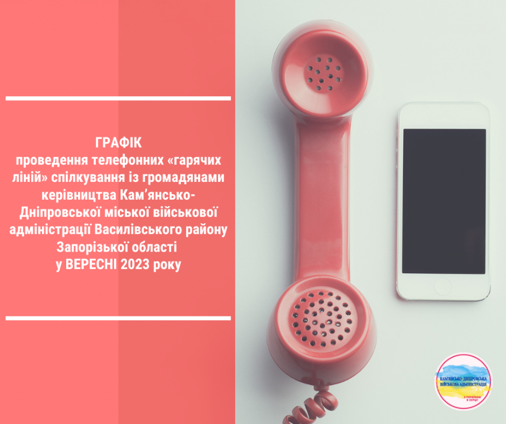 ГРАФІКпроведення телефонних «гарячих ліній» спілкування із громадянами керівництва Кам’янсько-Дніпровської міської військової адміністрації Василівського району Запорізької області у вересні 2023 року 1. ГРИЦЮК Андрій Іванович - начальник міської військової адміністрації05 та 19 вересня 2023 рокуТелефон «гарячої лінії»: +380667918702 2. ЯКОВЛЄВ Олександр Олександрович…