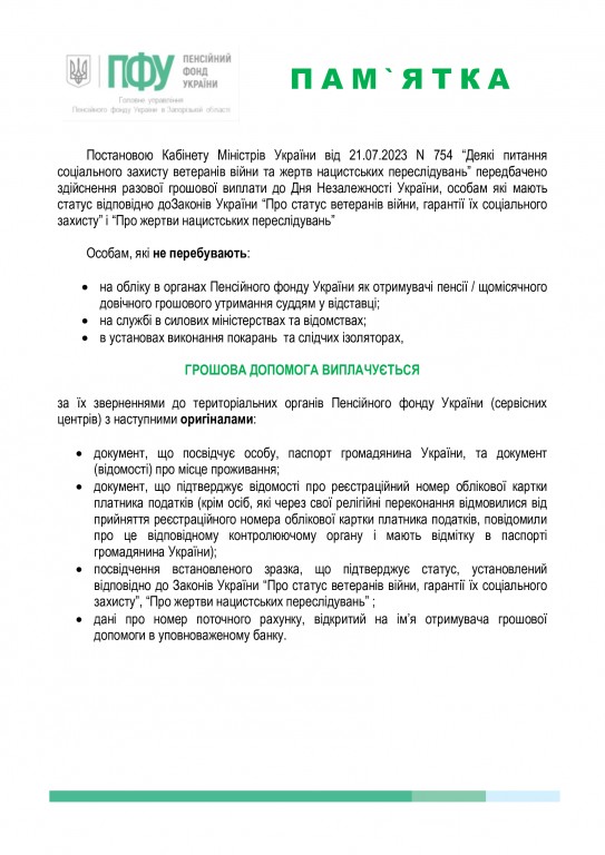 Постановою Кабінету Міністрів України від 21.07.2023 N 754 “Деякі питання соціального захисту ветеранів війни та жертв нацистських переслідувань” передбачено здійснення разової грошової виплати до Дня Незалежності України, особам які мають статус відповідно до Законів України “Про статус ветеранів війни, гарантії їх соціального захисту” і “Про жертви нацистських…
