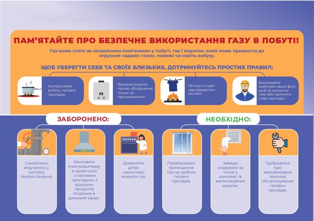 - експлуатуйте тільки справні газові прилади та використовуйте їх за призначенням! Не забувайте про проведення регулярного технічного обслуговування газових мереж та приладів у помешканні, для їх стабільної та безпечної роботи;