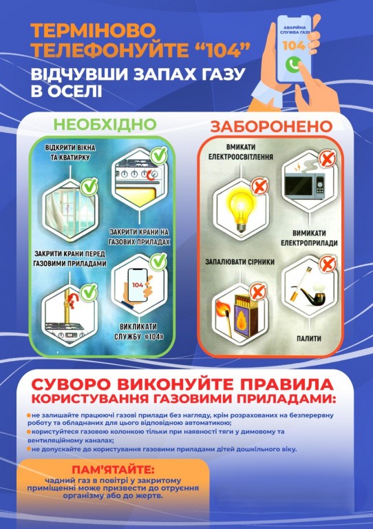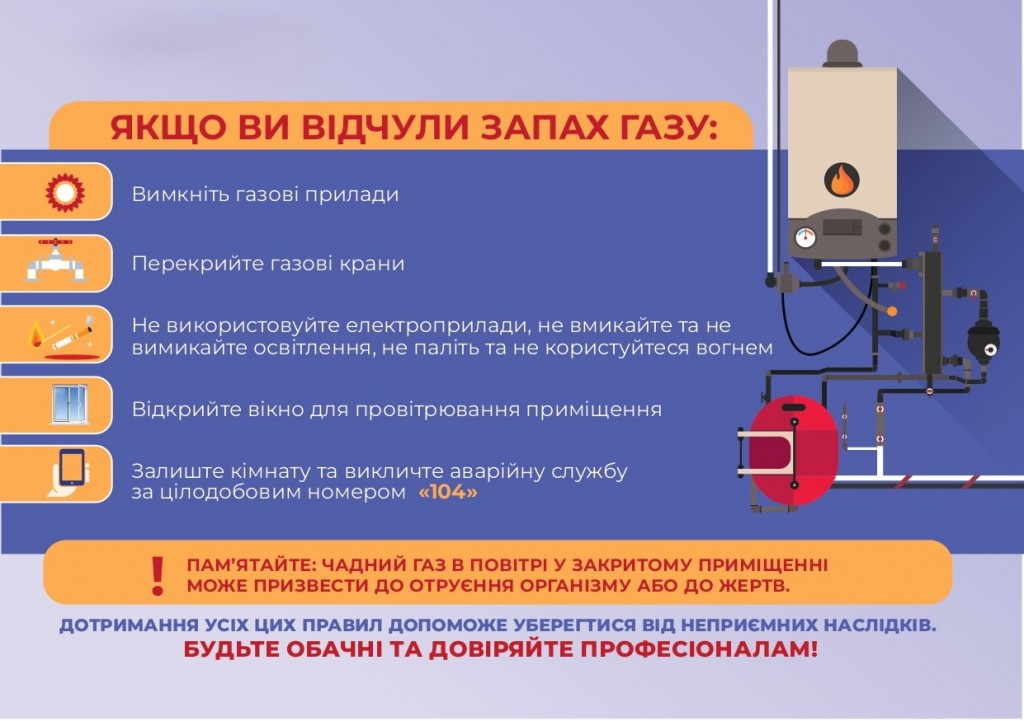 Якщо ви відчули запах газу, негайно перекрийте газові крани, покиньте приміщення та зателефонуйте за номером «104»!