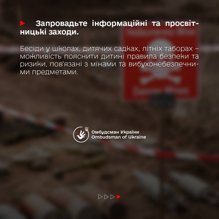 🔺 З початку російського повномасштабного вторгнення Україна стала однією з найбільш замінованих країн у світі. Міни та вибухонебезпечні предмети можуть ховатися будь-де: на полях, у лісах, на дорогах, навіть у житлових районах. Діти, через свою природну цікавість і незнання, часто стають жертвами таких небезпек. Для них шматок металу може виглядати як іграшка, а запал гранати – як щось цікаве та безпечне. Але кожен невірний крок може стати фатальним.