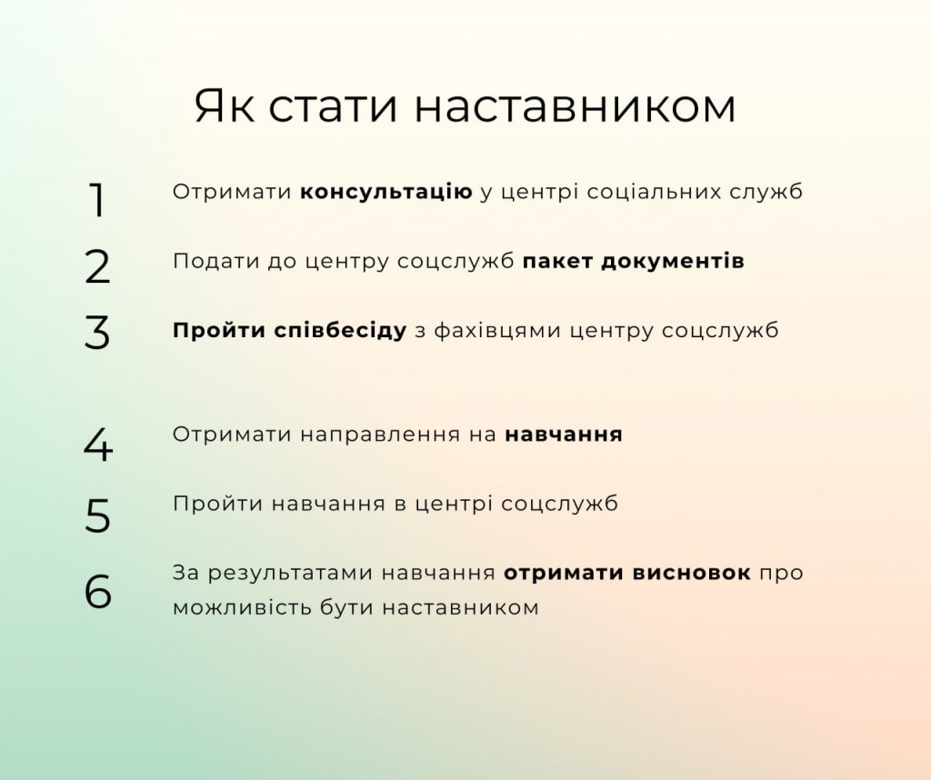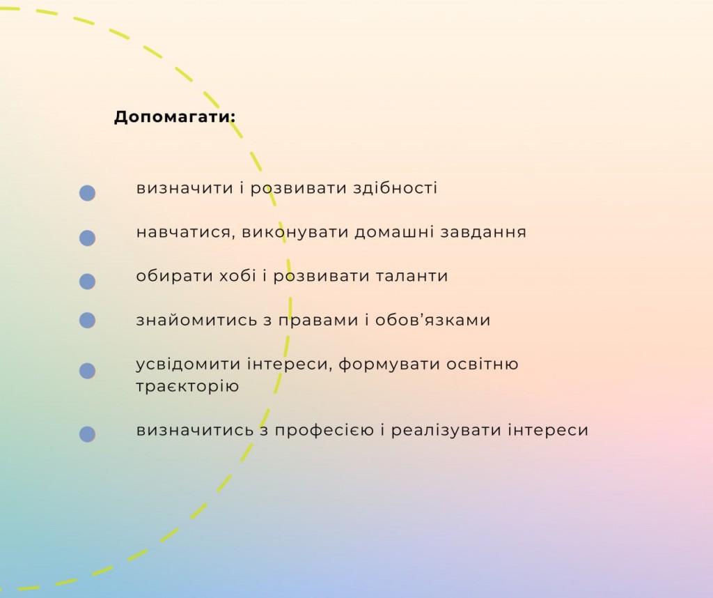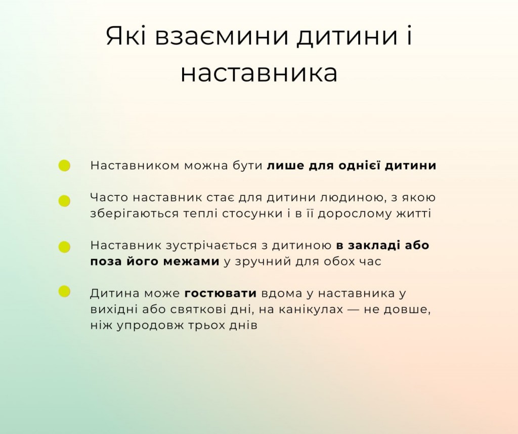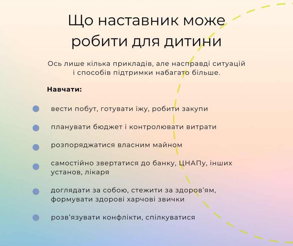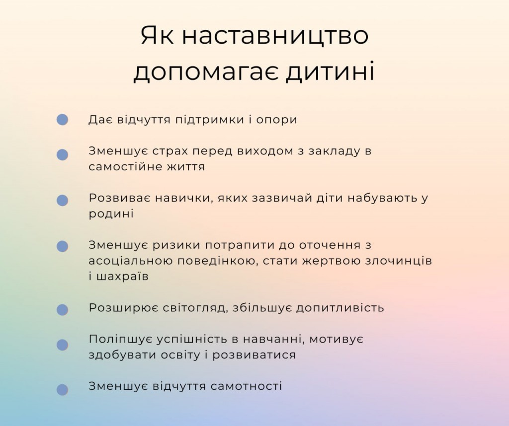 👨👩👧👧 Такою людиною може стати наставник або наставниця. З наставником можна порадитись з приводу подальшої освіти, професії, побуту поза стінами закладу. А головне - він допомагає дитині розвивати потенціал, впевненість у власних силах, формувати культурні та моральні цінності.