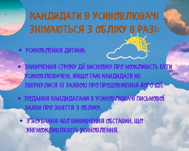 Усиновлення - це відповідальний крок, спрямований на реалізацію права кожної дитини зростати в сімейному середовищі, любові та турботі. Особи, які бажають подарувати дитині родинне тепло та піклування, проходять відповідну підготовку, ретельний відбір та беруться на облік як кандидати в усиновлювачі. Водночас законодавством передбачені випадки, коли перебування на такому обліку може бути припинене…