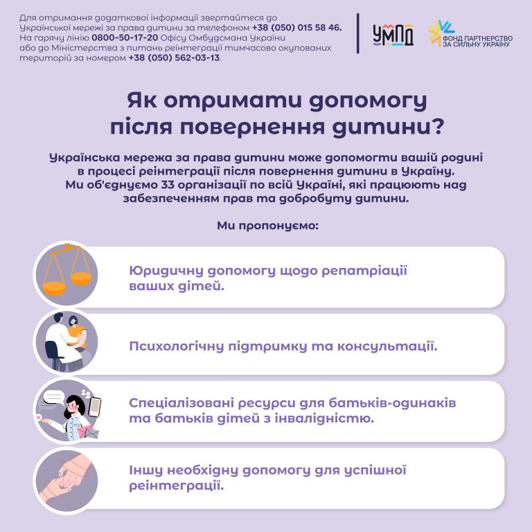 🙌 Українська мережа за права дитини готова допомогти вашій родині на кожному етапі адаптації дитини. Вони об'єднують 33 організації по всій Україні та пропонують необхідну допомогу для успішного повернення дитини до нормального життя. Партнерами Громадської спілки “Українська мережа за права дитини” є Міністерство з питань реінтеграції тимчасово окупованих територій України та Офіс Омбудсмана України.