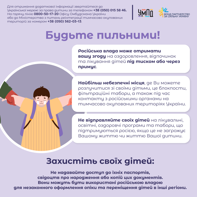 ❌Не відправляйте дітей на програми лікування чи оздоровлення, організовані росією. Захистіть документи своїх дітей, щоб уникнути їх незаконного переміщення.