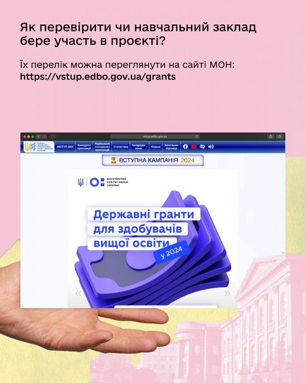 Уся інформація про заклади освіти, які долучилися до проєкту, та про те, як вирахувати коефіцієнт гранту тут (https://mon.gov.ua/news/onovlennia-alhorytmu-otrymannia-derzhavnykh-hrantiv-na-navchannia).