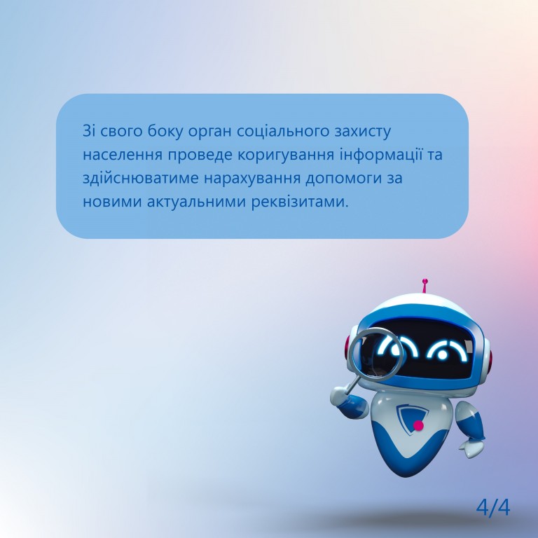 ВАЖЛИВО! На сьогодні повідомити про зміну банківських реквізитів можна тільки особисто звернувшись до органу соціального захисту населення. Онлайн такого функціоналу наразі не запроваджено. Також зверніть увагу, що лише орган соціального захисту населення може оновити інформацію, ЦНАП чи уповноважена особа сільської, селищної ради - НІ!