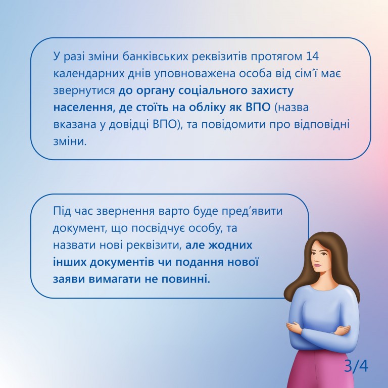 Іншими словами, у разі зміни банківських реквізитів протягом 14 календарних днів уповноважена особа від сімʼї має звернутися до органу соціального захисту населення, де стоїть на обліку як ВПО (назва вказана у довідці ВПО), та повідомити про відповідні зміни. Під час звернення варто буде предʼявити документ, що посвідчує особу, та назвати нові реквізити, але жодних інших документів чи подання нової заяви вимагати не повинні.