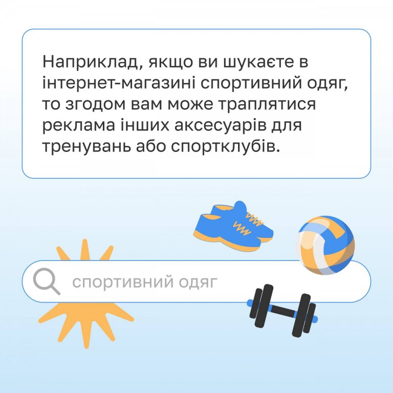 📲Наприклад, якщо ви шукаєте в інтернет-магазині спортивний одяг, то згодом вам може траплятися реклама інших аксесуарів для тренувань або спортклубів.