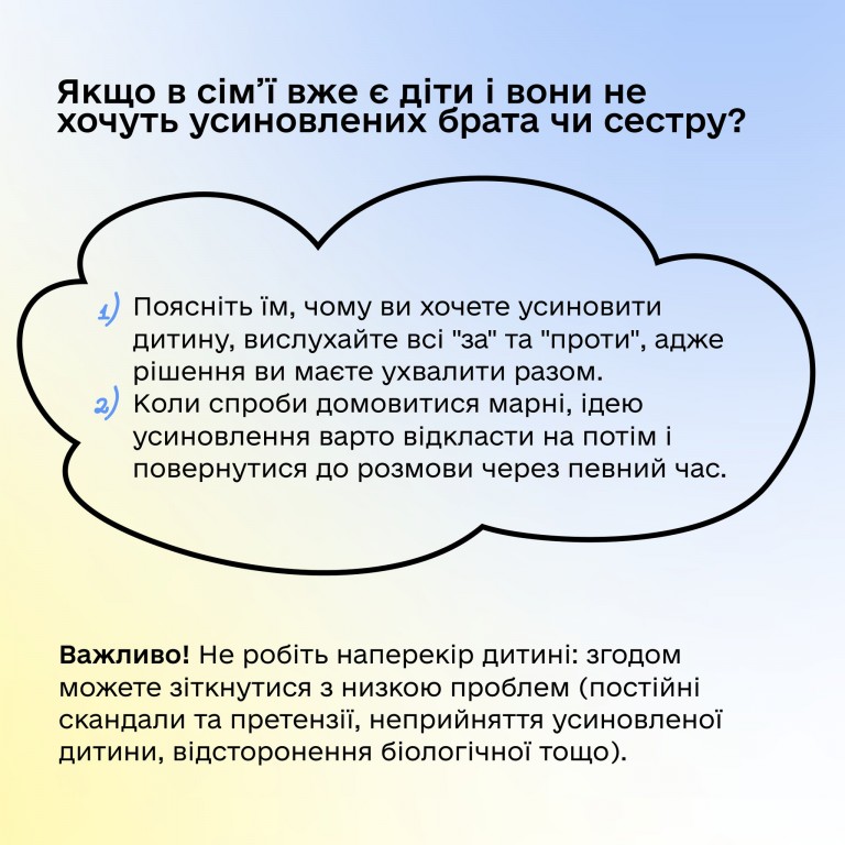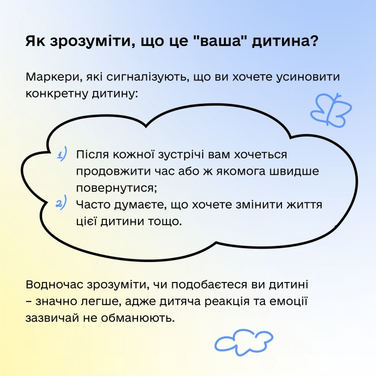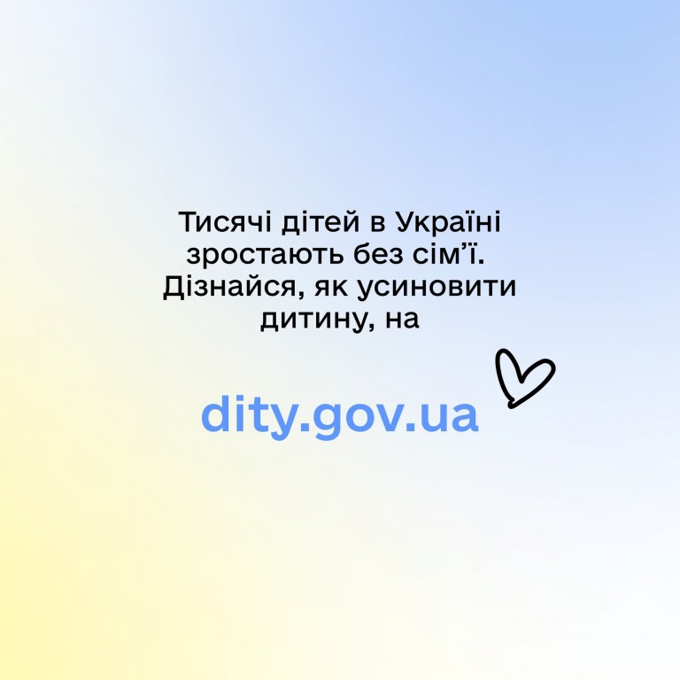 👫 Тисячі дітей в Україні зростають без батьківської турботи. Дізнайтеся, як усиновити дитину, на Єдиній державній платформі про усиновлення та сімейні форми виховання "Україна для кожної дитини" (https://www.dity.gov.ua/uk)
