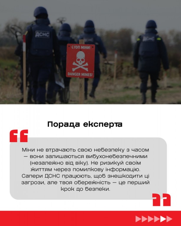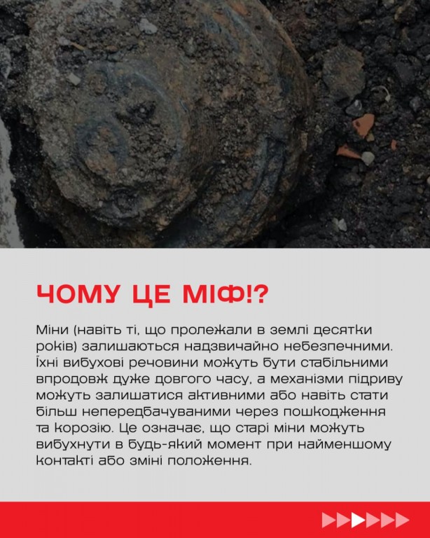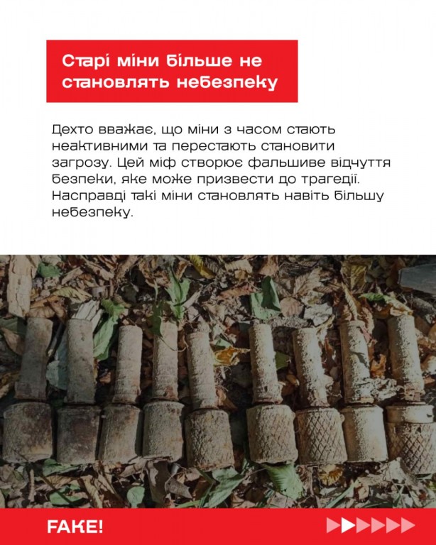Міни та інші боєприпаси — це не іграшка, з роками вони не стають безпечнішими. Один із небезпечних міфів каже: "Міни застарівають і стають безпечними через кілька років". Це неправда, яка може призвести до трагічних наслідків.