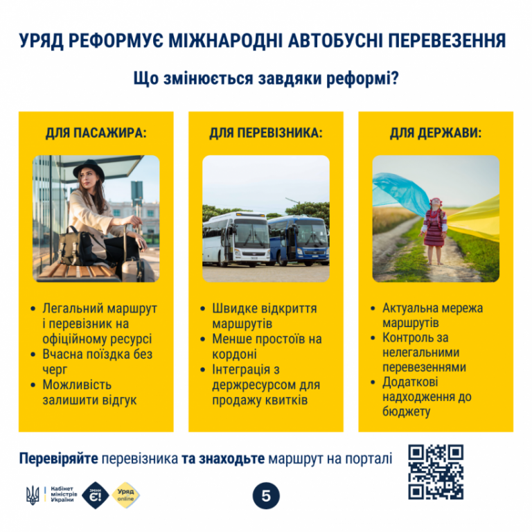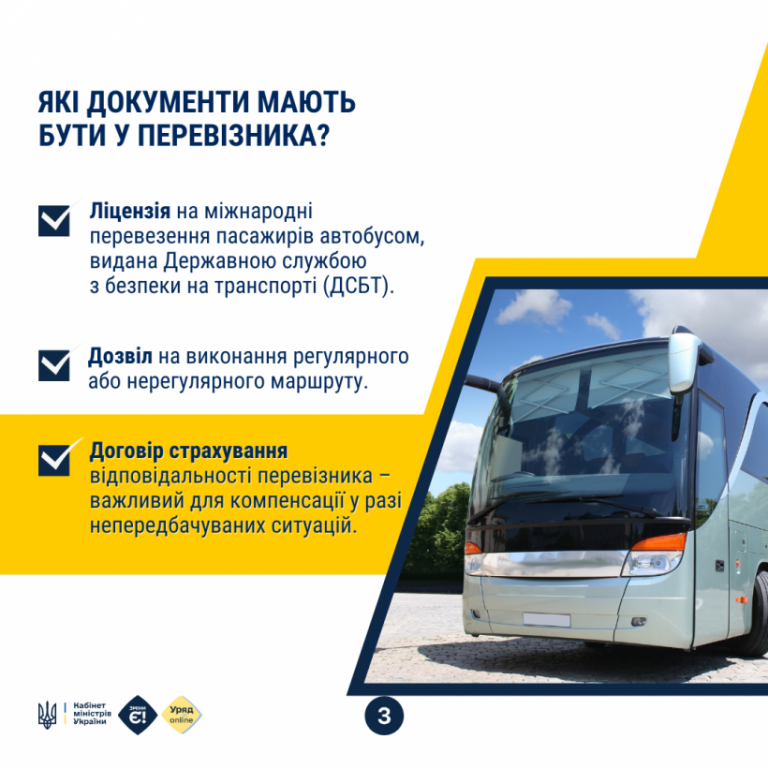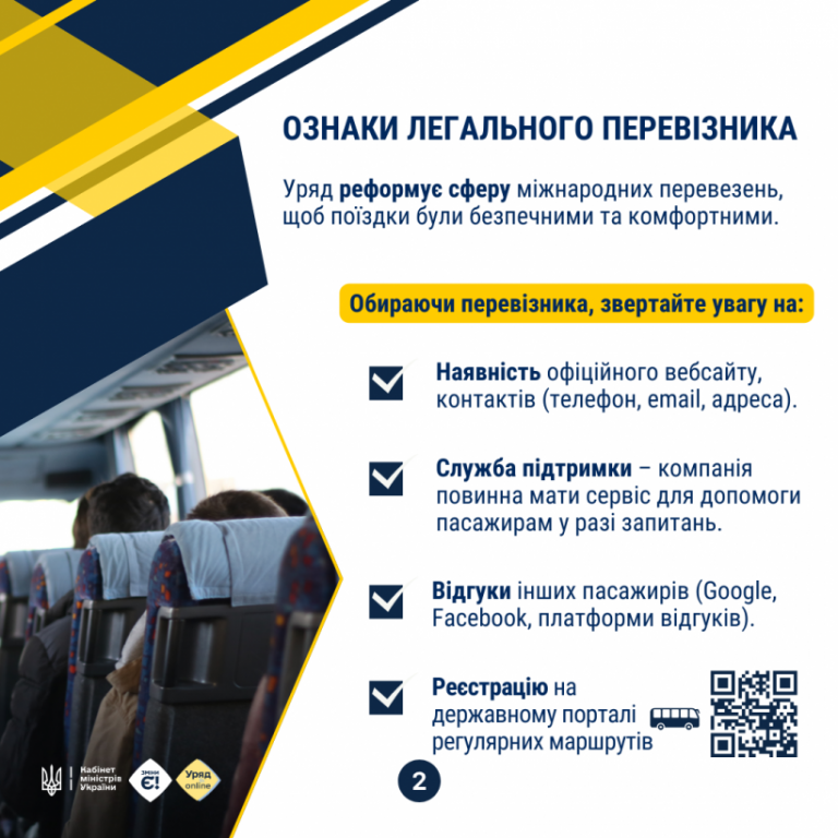 🚍 Уряд реформує сферу міжнародних перевезень, щоб поїздки були безпечними та комфортними. Обираючи автобус для поїздки за кордон, переконайтеся, що перевізник має ліцензію, страховку та працює офіційно.