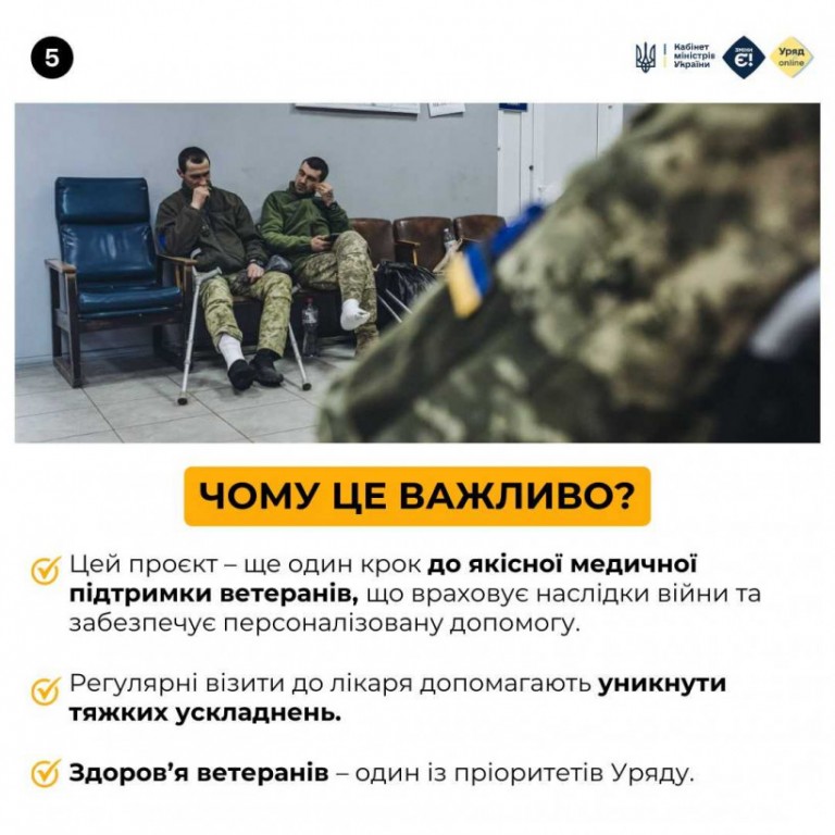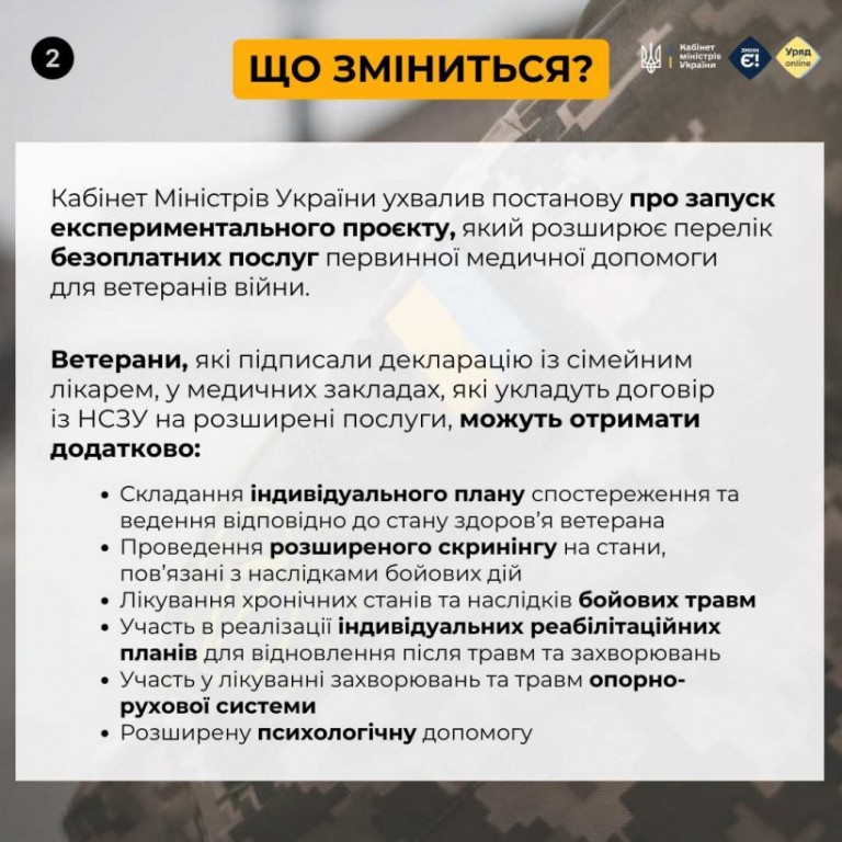 🩺 Ветерани отримають більше безоплатних медичних послуг. Йдеться зокрема про лікування хронічних станів та наслідків бойових травм, проведення розширеного скринінгу, участь в реалізації індивідуальних реабілітаційних планів.