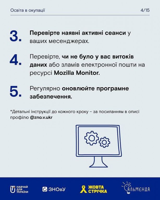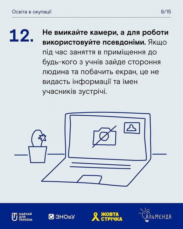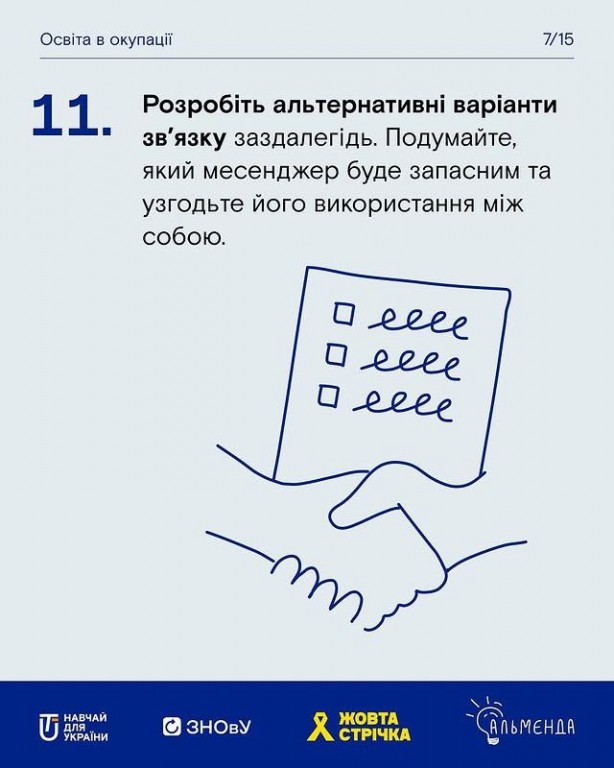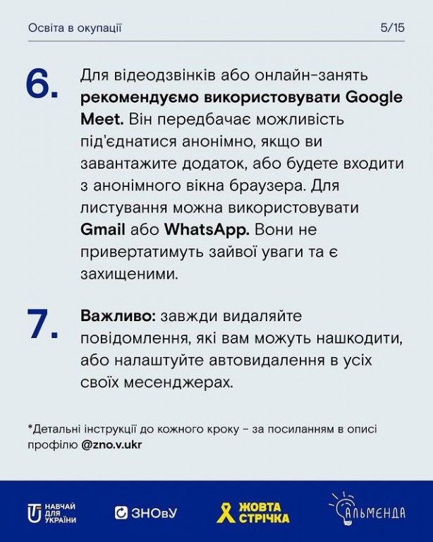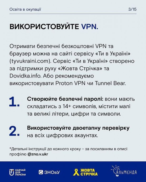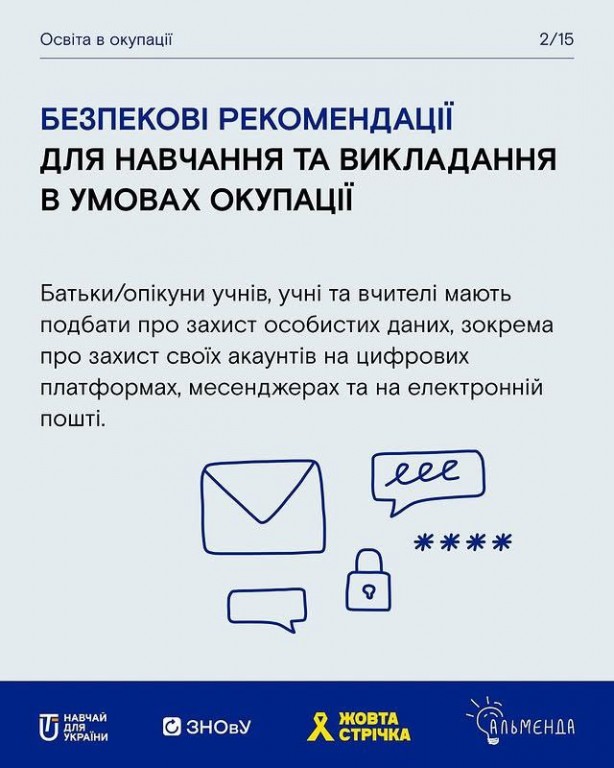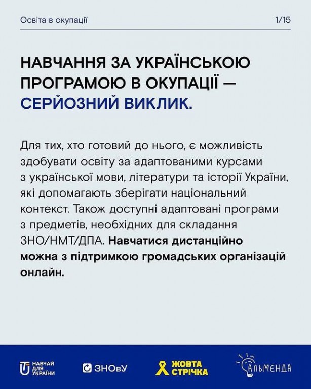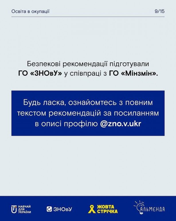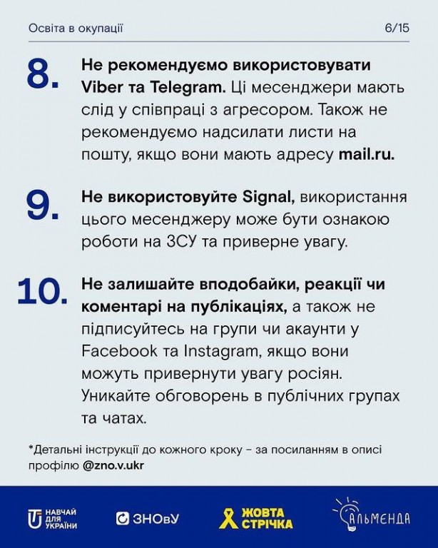 👉У цій публікації Рух спротиву на тимчасово окупованих територіях України "Жовта Стрічка" (https://t.me/yellowribbon_ua) разом з ГО "Навчай для України", ГО "ЗНОву" та ЦГП "Альменда" зібрали інформацію про освітні можливості та безпекові рекомендації для дітей, які продовжують навчатися за українськими освітніми програмами, проживаючи на тимчасово окупованих територіях.