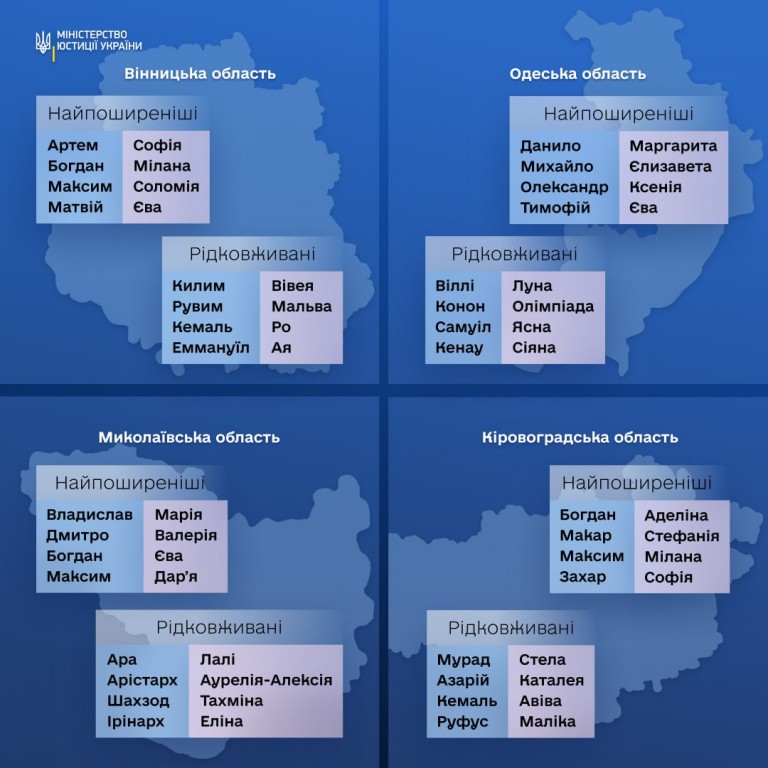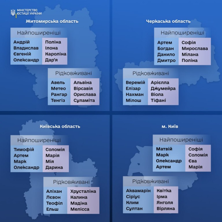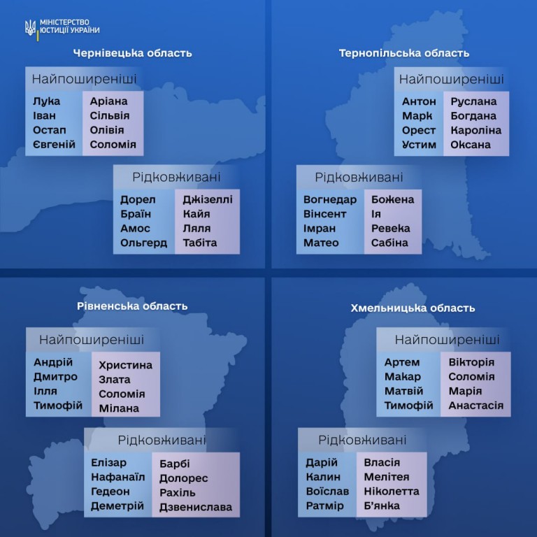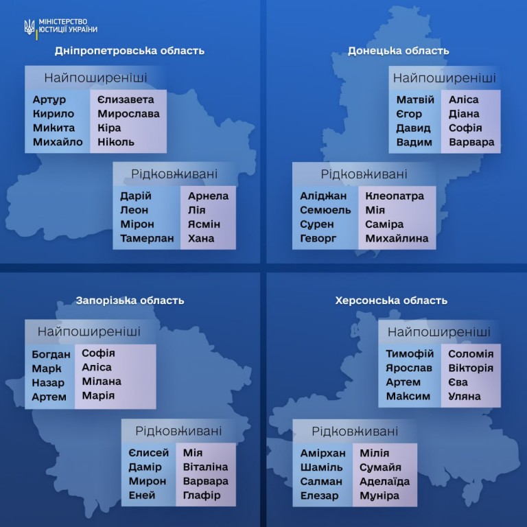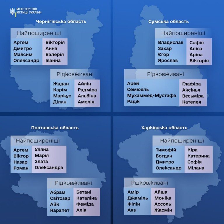 🇺🇦 Міністерство юстиції України зазначило, що кожна область має свої унікальні імена, що надає всім куточкам нашої держави свого неповторного колориту. Наприклад, на заході України частіше зустрічаються такі імена, як Вікторія та Артем, тоді як на сході - Катерина та Дмитро. Північ України відзначається популярністю імен Анна та Максим, а на півдні України частіше можна зустріти Марію та Владислава. Крім популярних, кожна область України вирізняється рідковживаними іменами. Побачити більше можна в інфографіці.