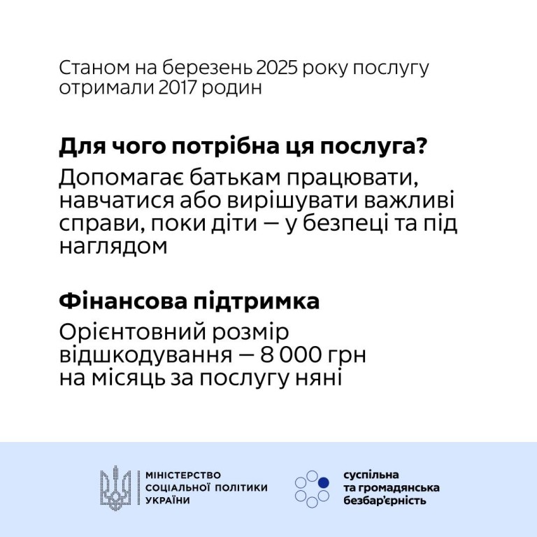 👉 Як зазначає Міністерство соціальної політики України, послугою «Муніципальна няня» вже скористалися понад дві тисячі родин. Станом на початок березня 2433 дитини перебувають під наглядом няні, поки батьки чи опікуни працюють.