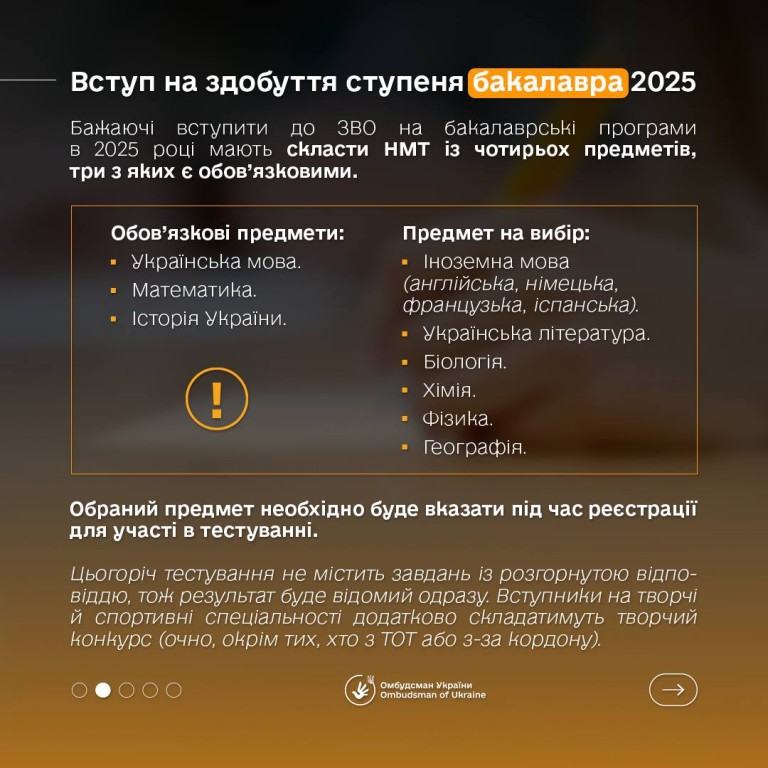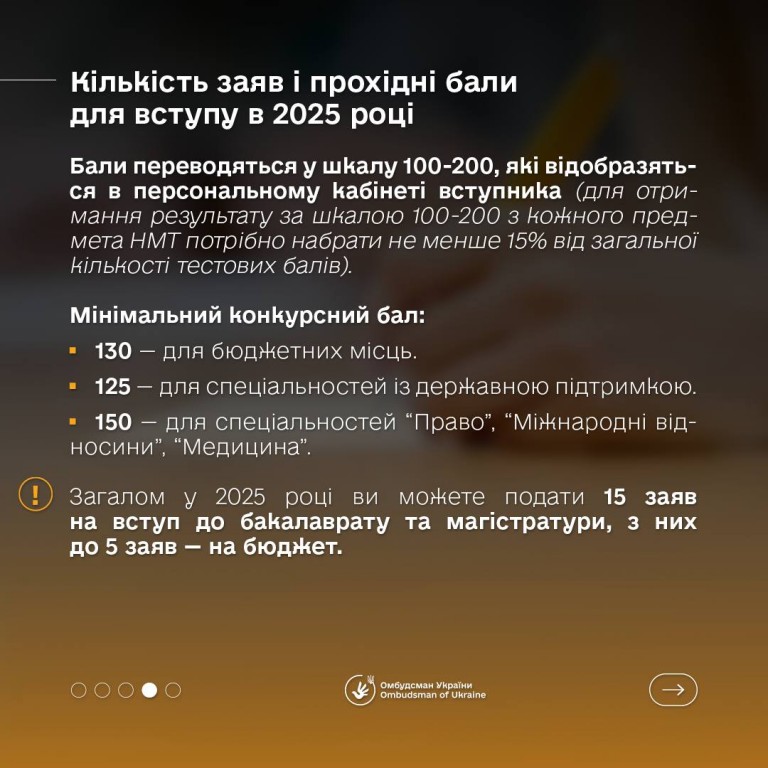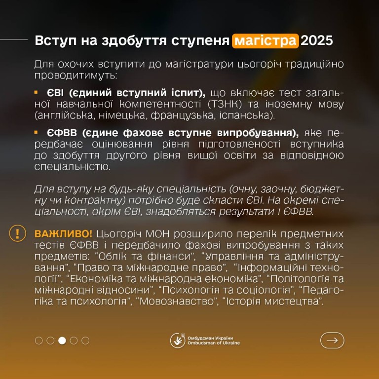 📲 Омбудсман надає інфографіку та посилання (https://mon.gov.ua/static-objects/mon/sites/1/vishcha-osvita/vstup-2025/03/03/poryadok-pryyomu-na-navchannya-dlya-zdobuttya-vyshchoyi-osvity-v-2025-rotsi-03-03-2025.pdf), за якими можна дізнатися всі деталі та дати вступу на бакалаврат і магістратуру в 2025 році.