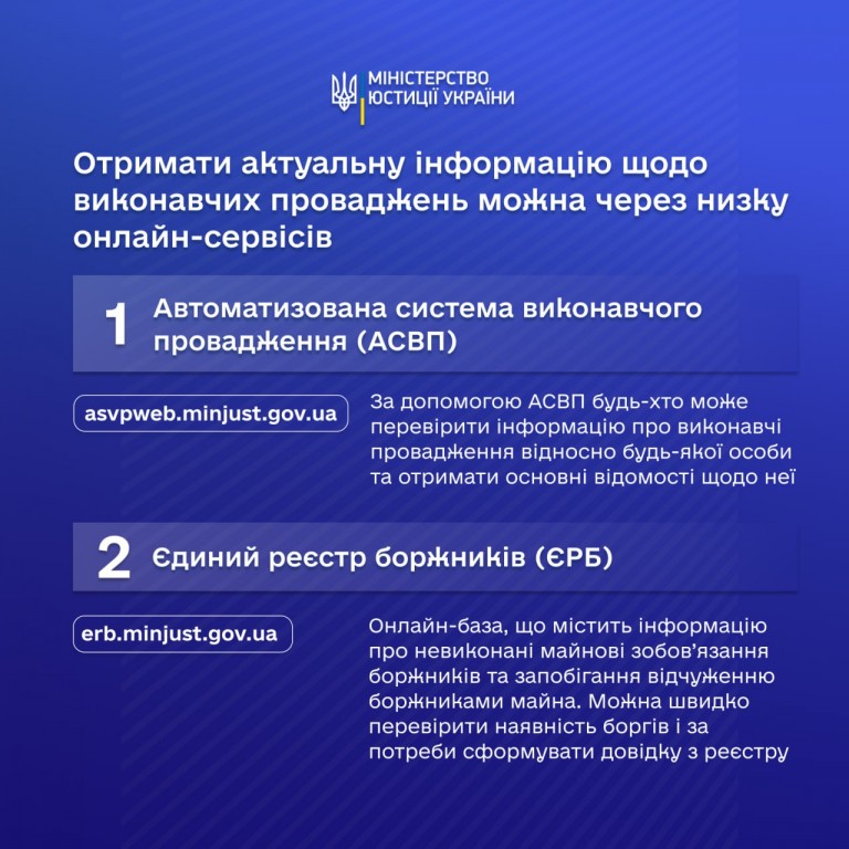 1️⃣ Автоматизована система виконавчого провадження (АСВП). Через спеціальний вебпортал (https://asvpweb.minjust.gov.ua/#/search-debtors) можна перевірити наявність виконавчих проваджень стосовно фізичних або юридичних осіб, переглянути їхній статус, отримати інформацію про стягувача, боржника, орган або приватного виконавця, у якого перебуває справа.