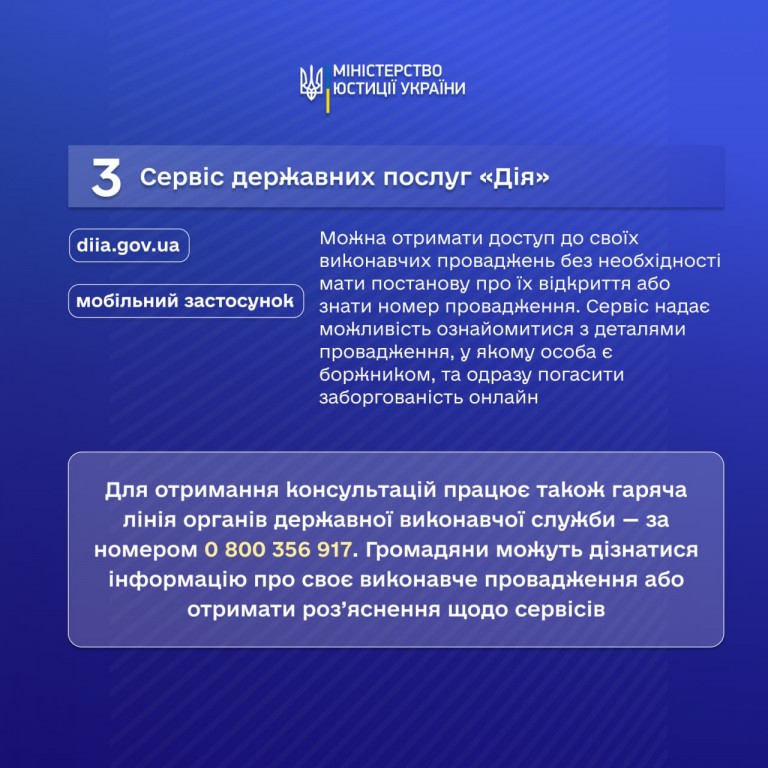 ☎️ Для отримання консультацій працює також гаряча лінія органів державної виконавчої служби 0 800 356 917. Громадяни можуть дізнатися інформацію про своє виконавче провадження або отримати роз’яснення щодо сервісів.