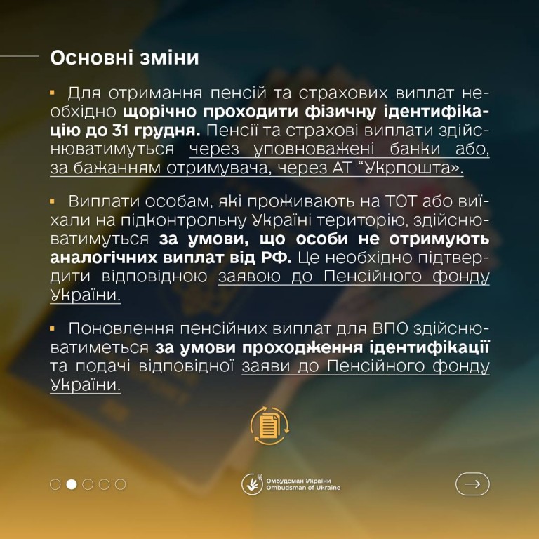 👉Омбудсман України Дмитро Лубінець зокрема зазначає, що розпочав діяти новий механізм виплати пенсій для ВПО, українців за кордоном та на ТОТ України.