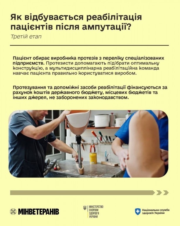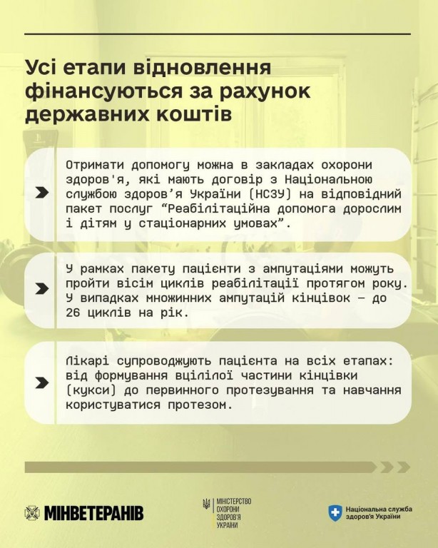 🔷Реабілітація після ампутації, протезування і знову реабілітація — усі етапи відновлення фінансуються за рахунок державних коштів. Отримати допомогу можна в закладах охорони здоров'я, які мають договір з Національною службою здоровʼя України (НСЗУ) на відповідний пакет послуг.