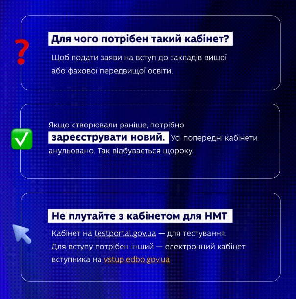 МОН України звертає увагу: кабінет учасника НМТ (на сайті Українського центру оцінювання якості освіти) не є електронним кабінетом вступника. Це інша система, призначена лише для участі в тестуванні.