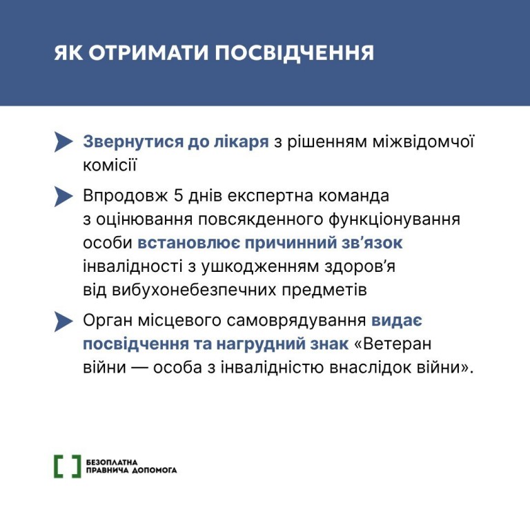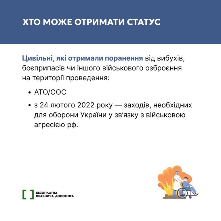 Як зазначає Безоплатна правнича допомога, цивільні також можуть отримати статус особи з інвалідністю, якщо зазнали поранень чи інших ушкоджень здоров’я через вибухонебезпечні предмети в умовах війни.