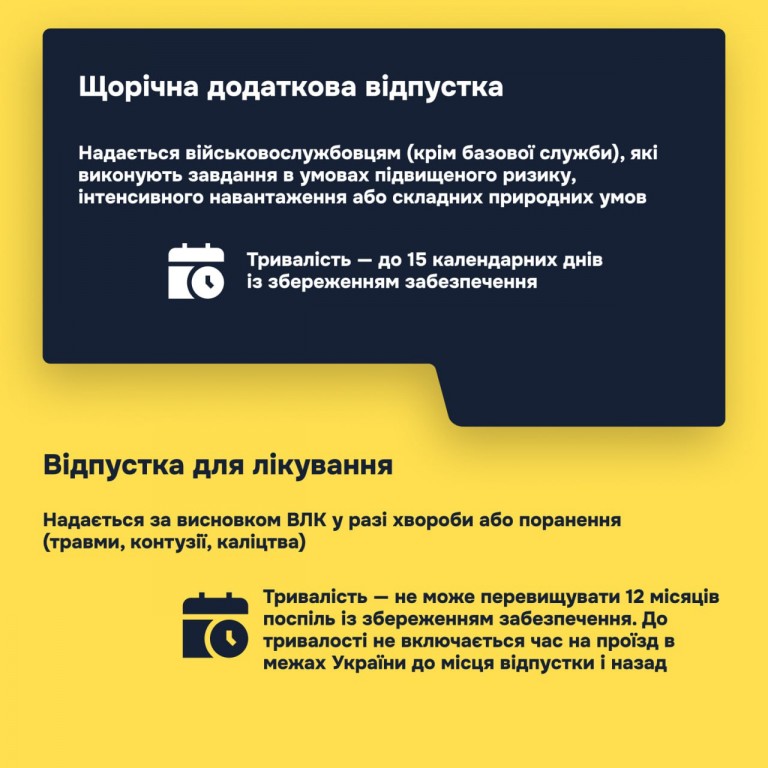 Надається за висновком ВЛК у разі хвороби або поранення (травми, контузії, каліцтва) із збереженням грошового забезпечення. Тривалість визначається станом здоров’я, але загалом не може перевищувати 12 місяців поспіль.