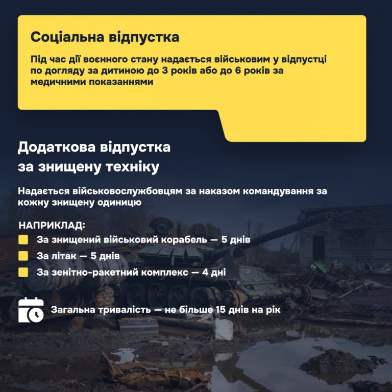 Зокрема, за кожну одиницю знищеної ворожої техніки військовослужбовцям надається відпустка такої тривалості: