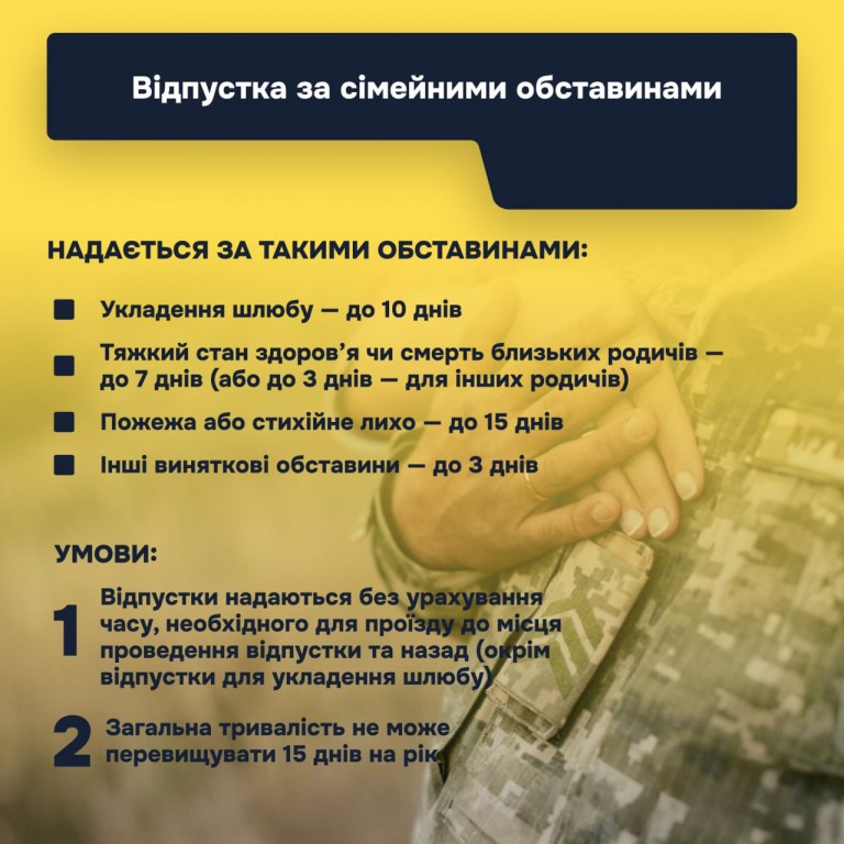 - в інших виняткових випадках, коли присутність військовослужбовця в сім'ї необхідна, за рішенням командира (начальника) військової частини — до 3 календарних днів (надається один раз протягом календарного року).