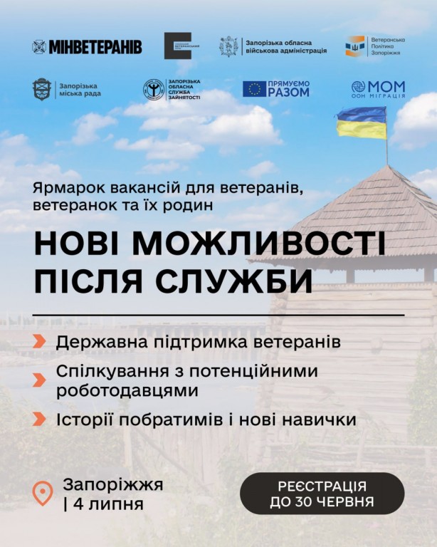 Ви - ветеран, ветеранка, член родини та шукаєте нові можливості для працевлаштування, освіти/перекваліфікації чи започаткування або розвитку власної справи? Запрошуємо відвідати ветеранський ярмарок вакансій у Запоріжжі.