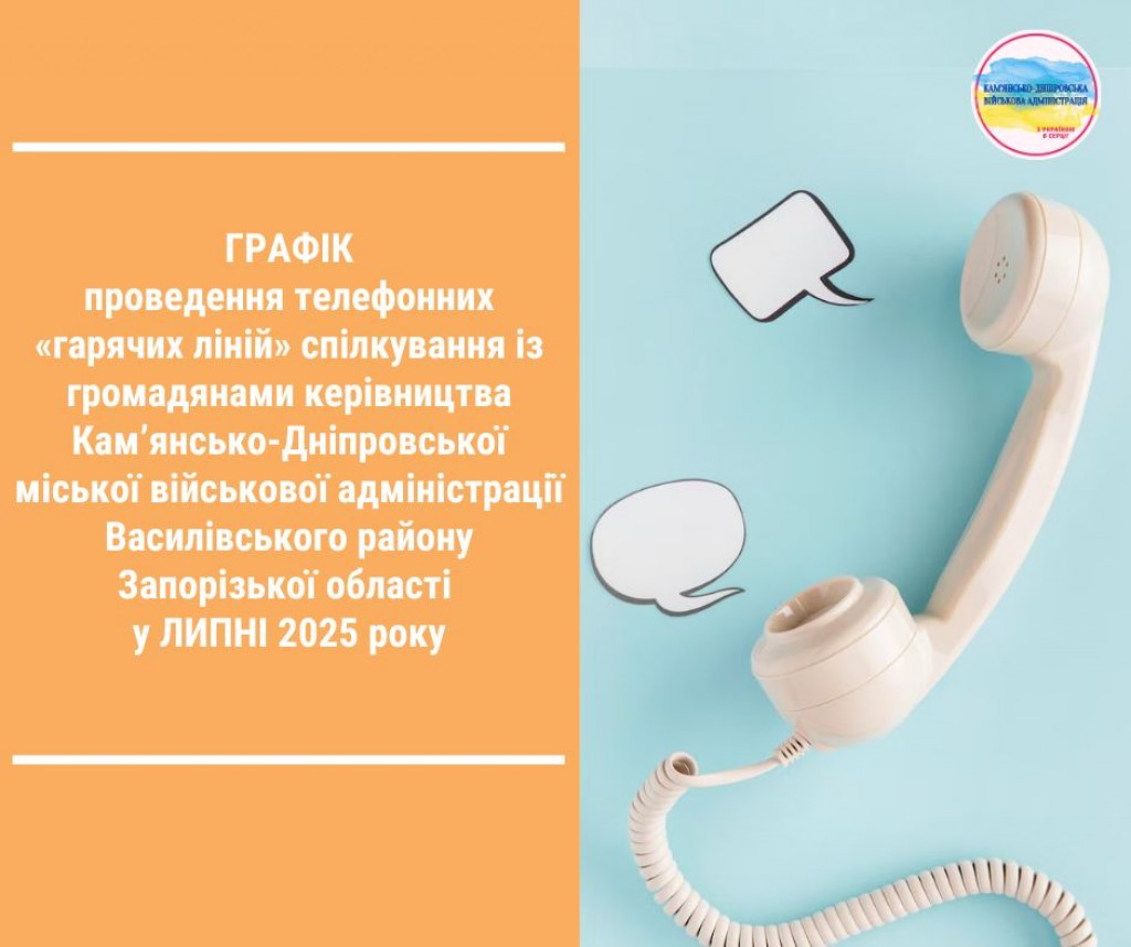 Графік проведення телефонних «гарячих ліній» спілкування із громадянами керівництва Кам’янсько-Дніпровської міської військової адміністрації Василівського району Запорізької області у липні 2025 року: