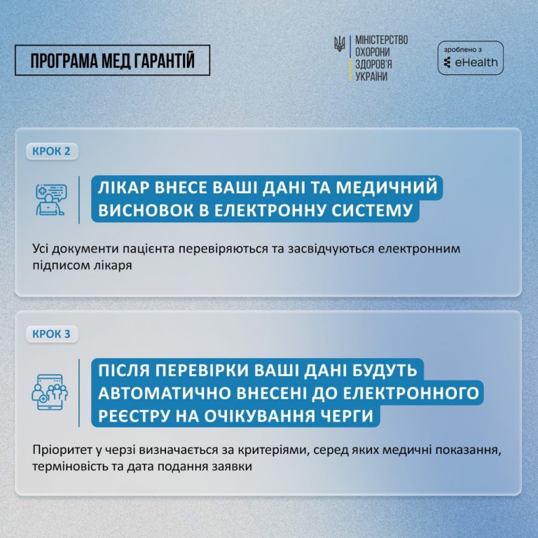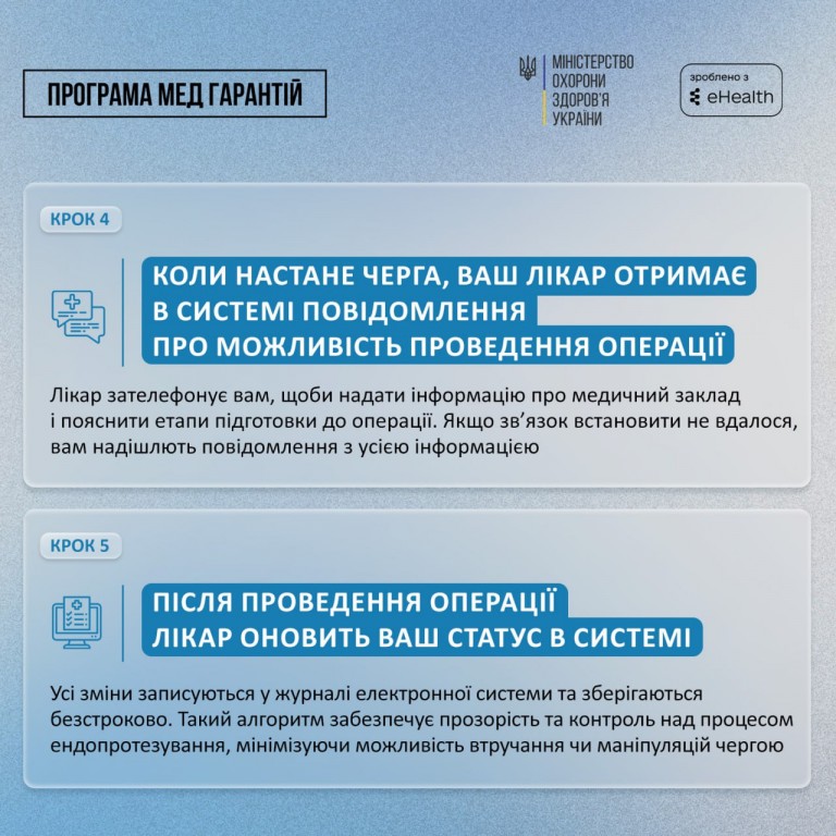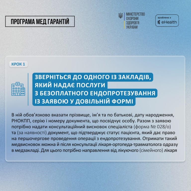 За інформацією МОЗ України, у 97 медзакладах, що мають договір з НСЗУ на відповідні послуги, діє електронна черга на безоплатне ендопротезування – це хірургічна заміна пошкодженого суглоба (найчастіше кульшового або колінного) штучним імплантом.