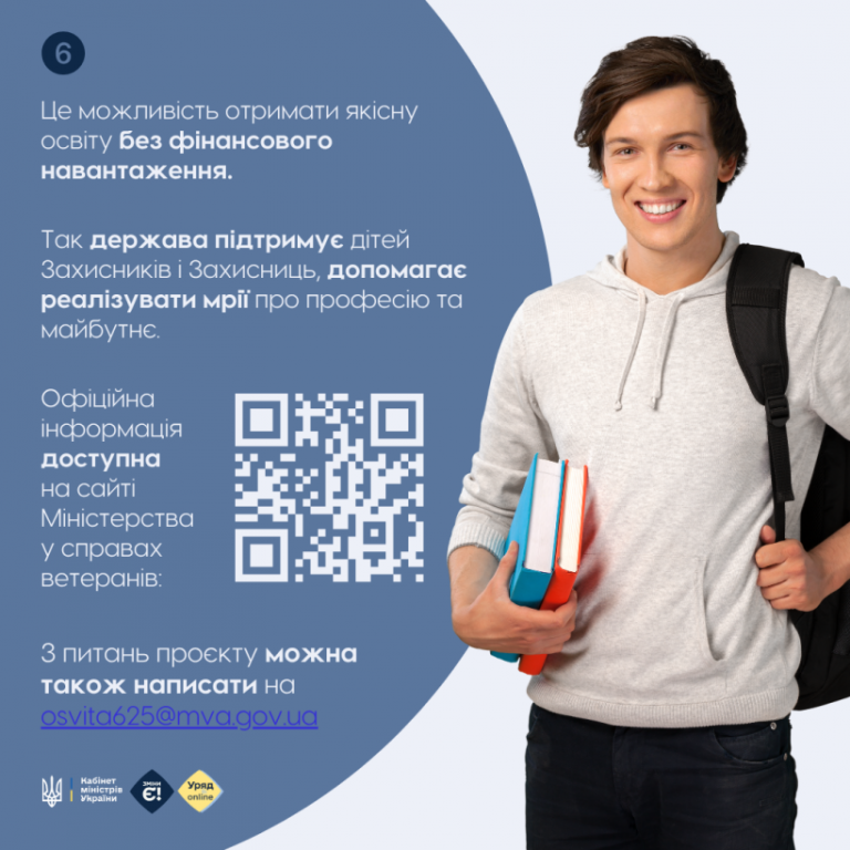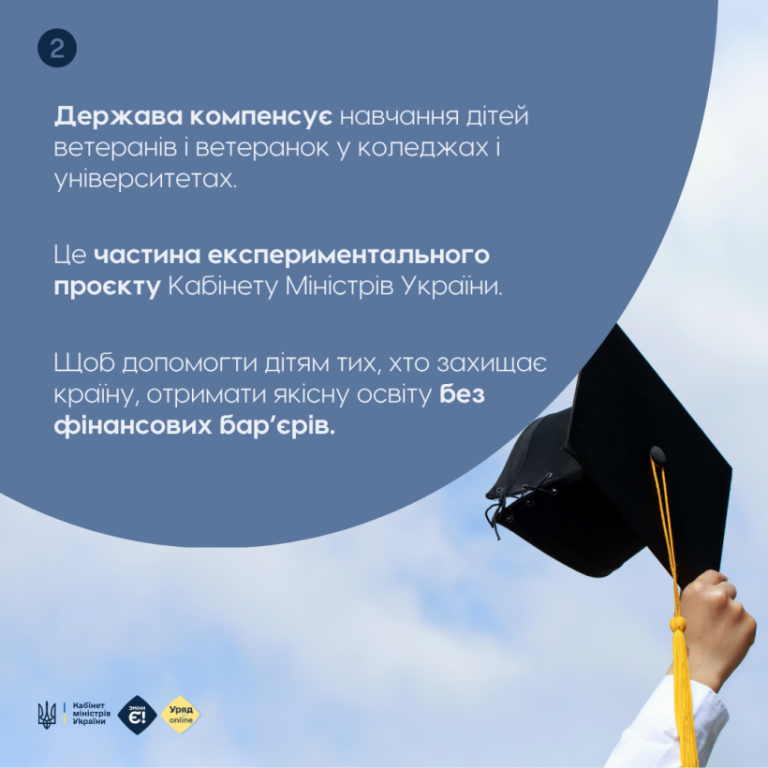 Держава компенсує вартість навчання дітей ветеранів і ветеранoк. Це частина експериментального проєкту Кабінету Міністрів України.