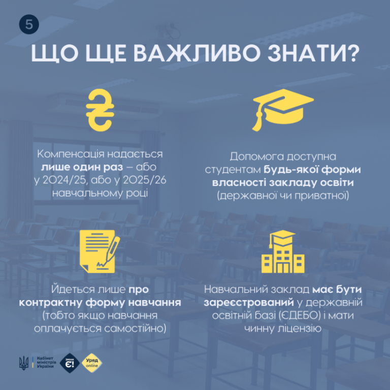 Компенсація можлива для дітей, які навчаються за контрактом у фахових коледжах або університетах.