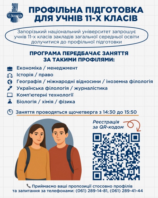 Запорізький національний університет запрошує учнів 11-х класів ЗЗСО приєднатися до профільної підготовки. Заняття відбуватимуться у змішаному форматі - як онлайн, так і офлайн, що дає можливість долучитися всім охочим, незалежно від місця перебування. Програма підготовки передбачає заняття за такими профілями: Економіка/менеджмент Історія/право Географія/міжнародні відносини/іноземна філологія…