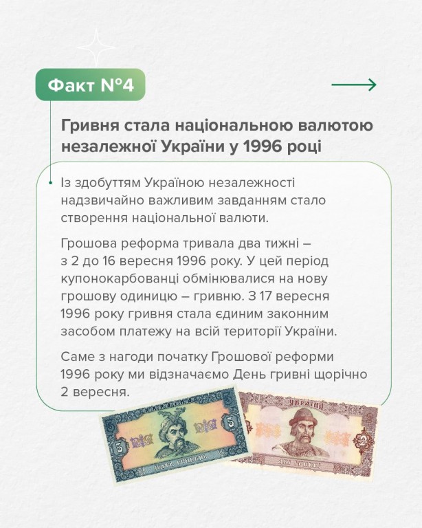 Саме цього дня 1996 року Національний банк України розпочав грошову реформу, що стала однією з найважливіших подій в історії нашої незалежності. Обмін українських купоно-карбованців на гривні тривав два тижні, і вже з 17 вересня гривня стала єдиним законним платіжним засобом. З того часу гривня завжди з нами.