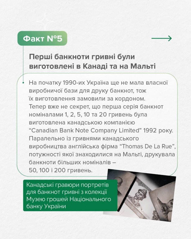 - Перші банкноти були надруковані за кордоном. Лише згодом, завдяки запуску власного Банкнотно-монетного двору НБУ, Україна почала самостійно виробляти свою валюту.