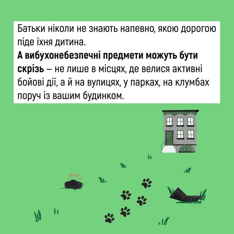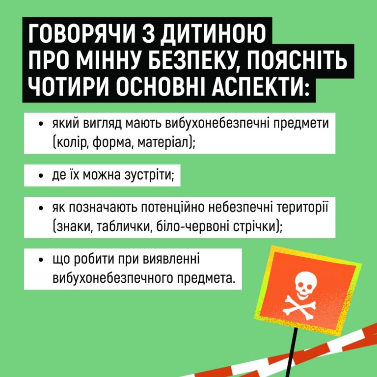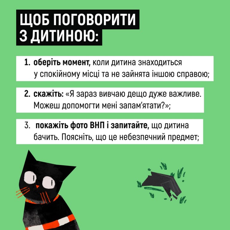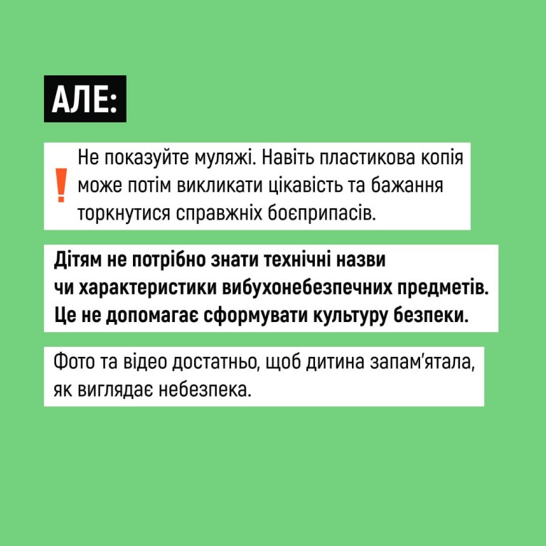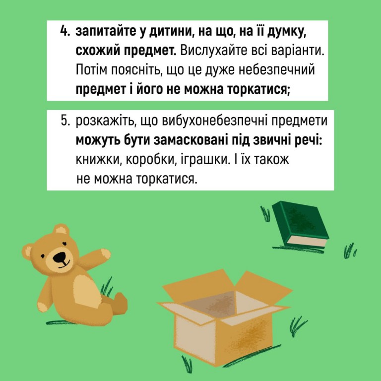 Поцікавтеся, чи знають вони, як виглядають вибухонебезпечні предмети. Та розкажіть про мінну безпеку без страшних історій та залякувань - за порадами в картках.