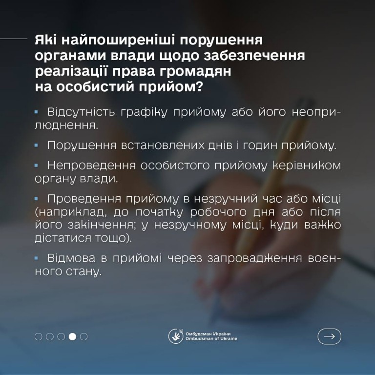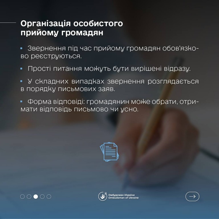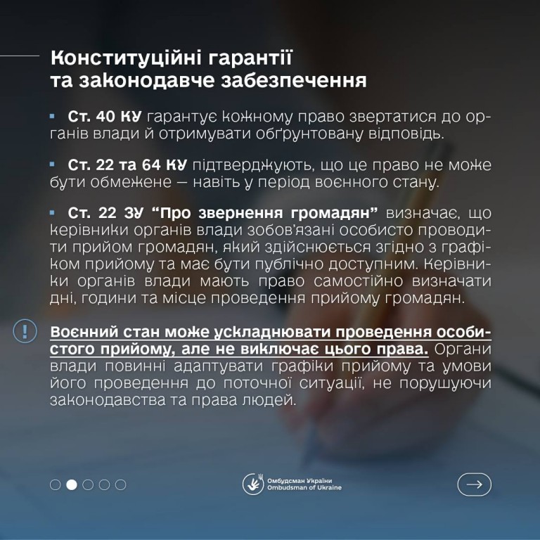 Право на особистий прийом залишається важливим інструментом захисту прав громадян, - наголошує Омбудсман України. Його гарантує Конституція України та Закон України “Про звернення громадян”.