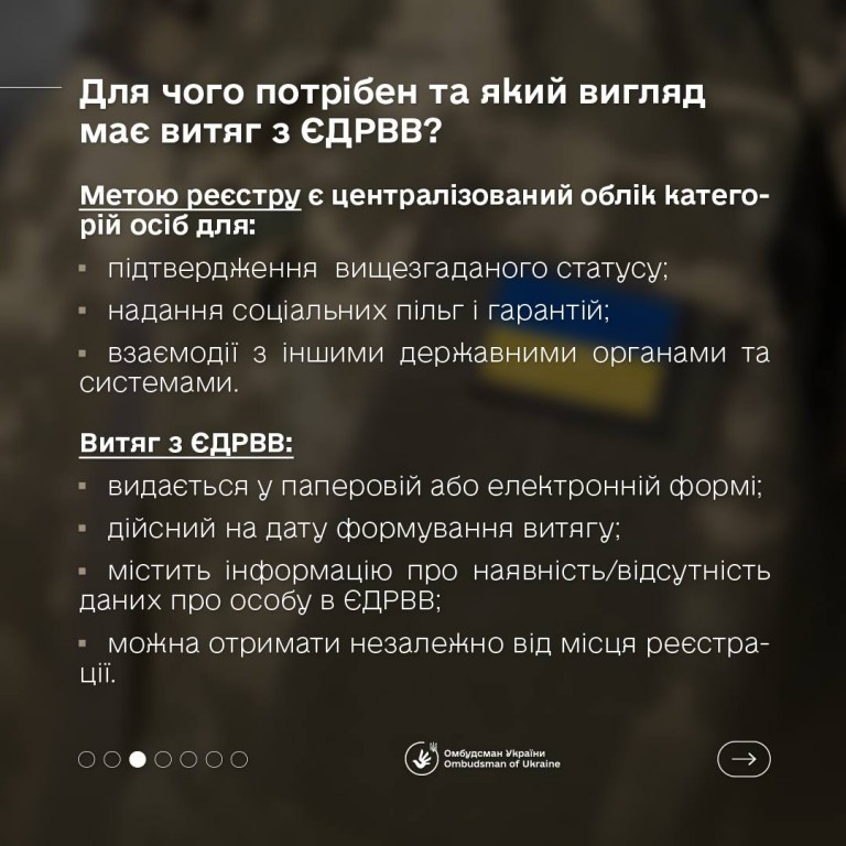 Витяг з Єдиного державного реєстру ветеранів війни (ЄДРВВ) підтверджує встановлення відповідного статусу, який надає право на пільги і соціальні гарантії. Документ також необхідний членам родин осіб зниклих безвісти за особливих обставин та військовополонених для оформлення відповідних пільг і компенсацій.