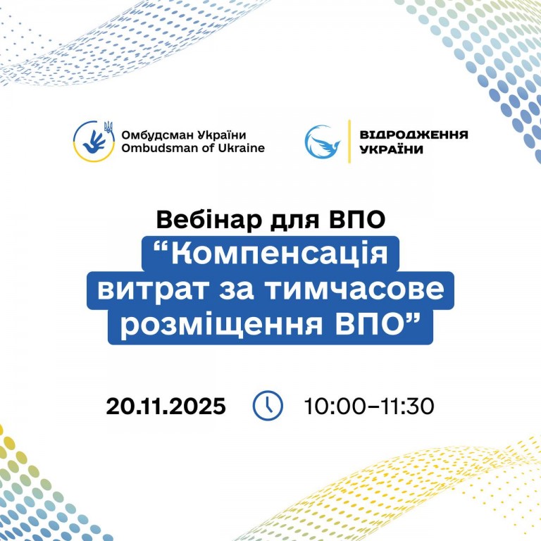 20 ЛИСТОПАДА ВІДБУДЕТЬСЯ ВЕБІНАР ДЛЯ ВПО НА ТЕМУ: "КОМПЕНСАЦІЯ ВИТРАТ ЗА ТИМЧАСОВЕ РОЗМІЩЕННЯ ВПО"