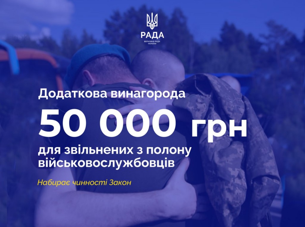 15 листопада 2025 року набрав чинності Закон, який встановлює додаткову винагороду у розмірі 50 000 грн для звільнених з полону військовослужбовців, що перебувають на стаціонарному лікуванні понад 30 днів. Про це повідомляє Верховна Рада України. Зокрема, виплата здійснюватиметься щомісяця протягом усього періоду безперервного лікування. Довідка про обставини травми або захворювання…