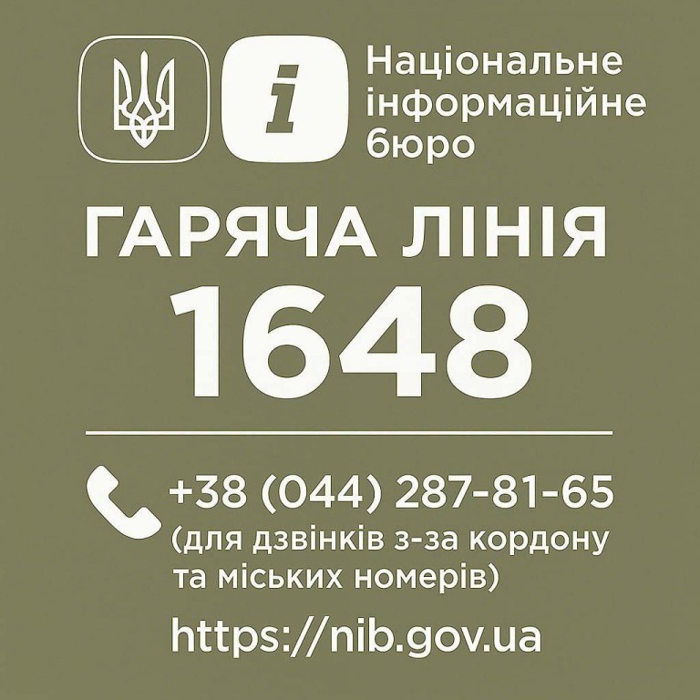 Гаряча лінія Національного інформаційного бюро працює цілодобово. Тут можна повідомити про полон, зникнення безвісти, незаконну депортацію чи примусову мобілізацію на тимчасово окупованих територіях. 1648 – в Україні; +38 (044) 287-81-65 – для дзвінків з-за кордону та міських номерів. Подати інформацію онлайн можна на сайті Національного інформаційного…