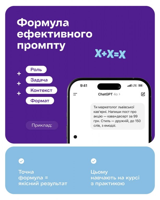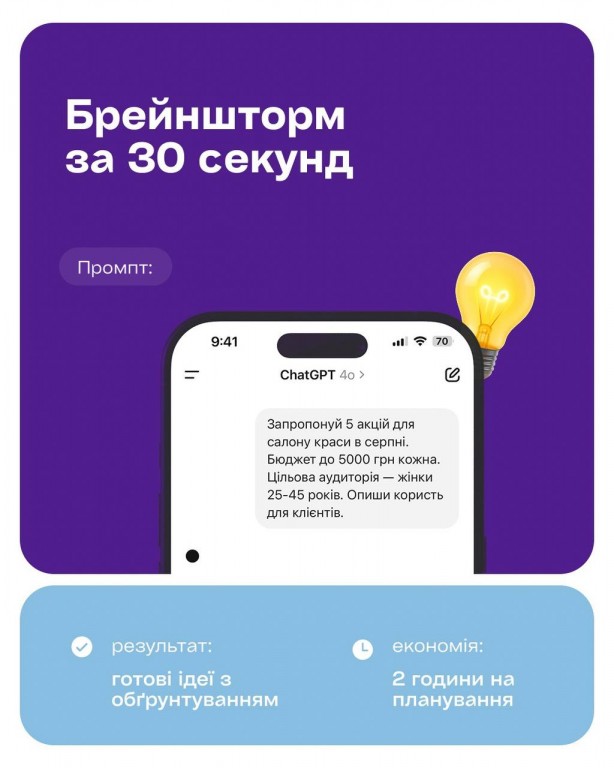 - Отримаєш готові промпти (текстовий запит або інструкція, яку користувач надає штучному інтелекту, щоб отримати бажану відповідь для бізнес-завдань).