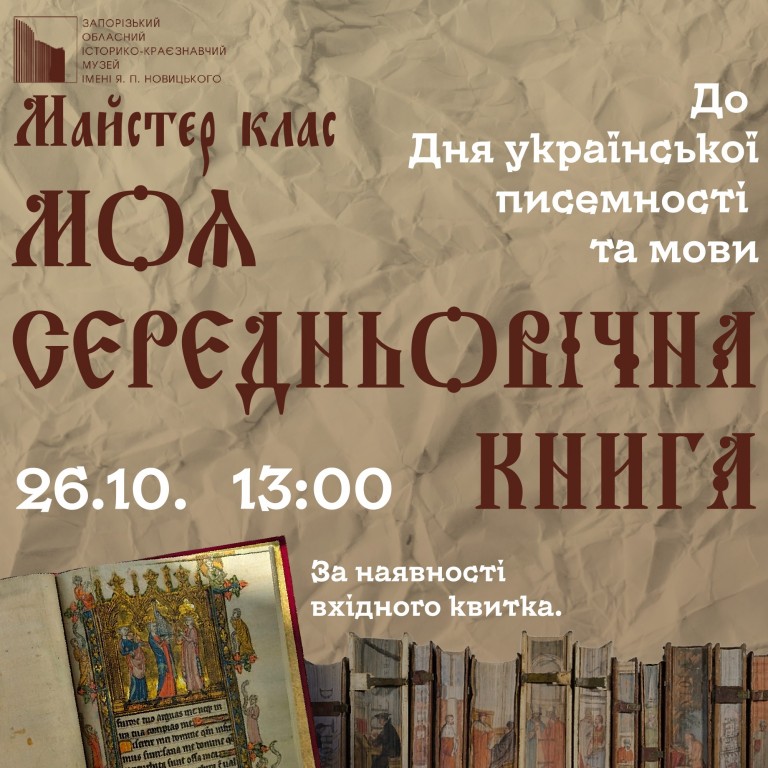 До Дня української писемності та мови Запорізький обласний історико-краєзнавчий музей імені Я.П. Новицького запрошує на майстер-клас «Моя середньовічна книга»!