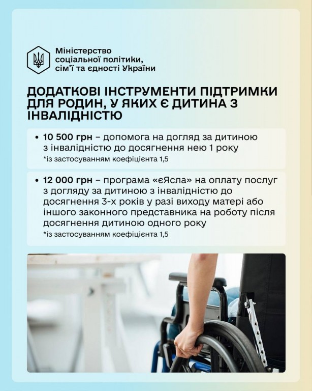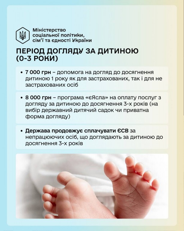 - Програма підтримки «єЯсла» - 8 000 грн (або 12 000 грн для дитини з інвалідністю) у разі виходу матері чи іншого законного представника на роботу після досягнення дитиною 1 року.